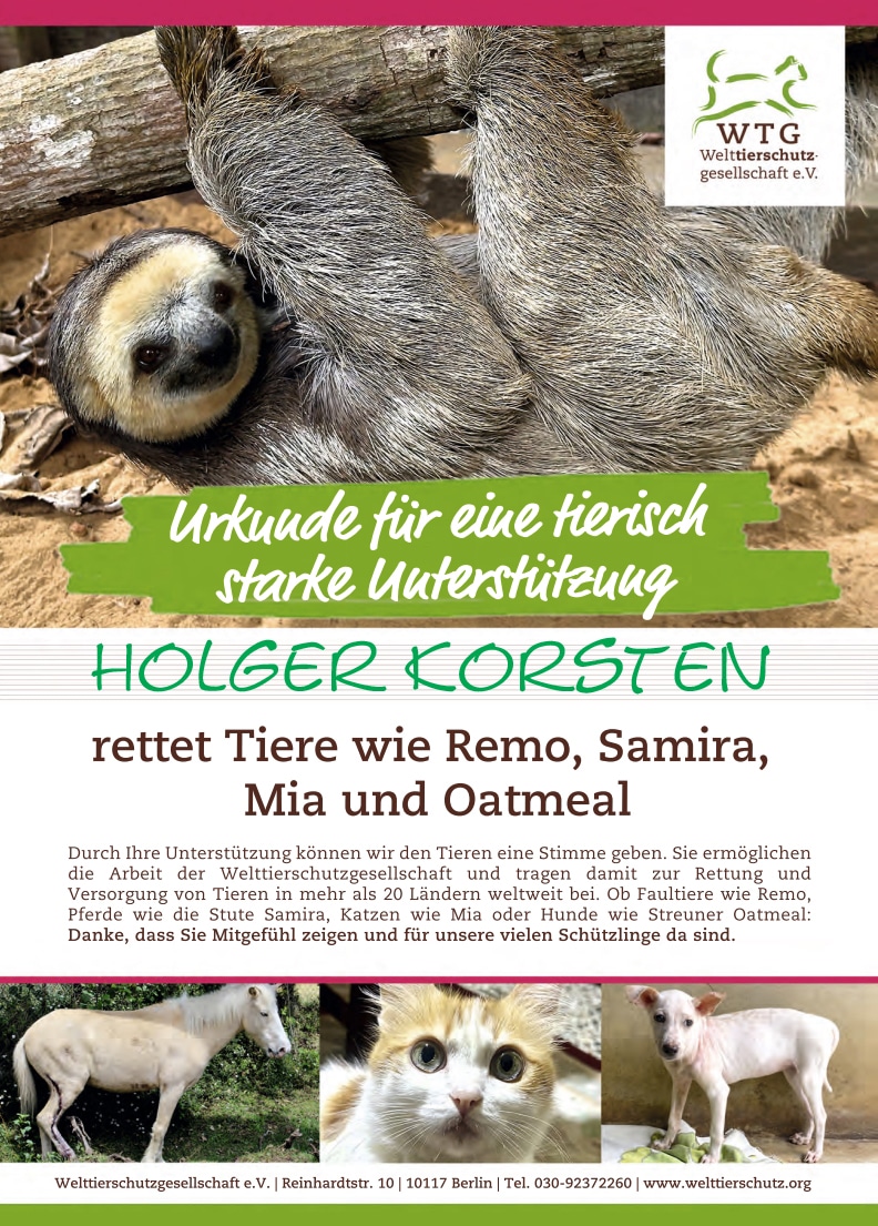 Mit großer Freude darf ich diese besondere Urkunde der Welttierschutzgesellschaft e.V. präsentieren.